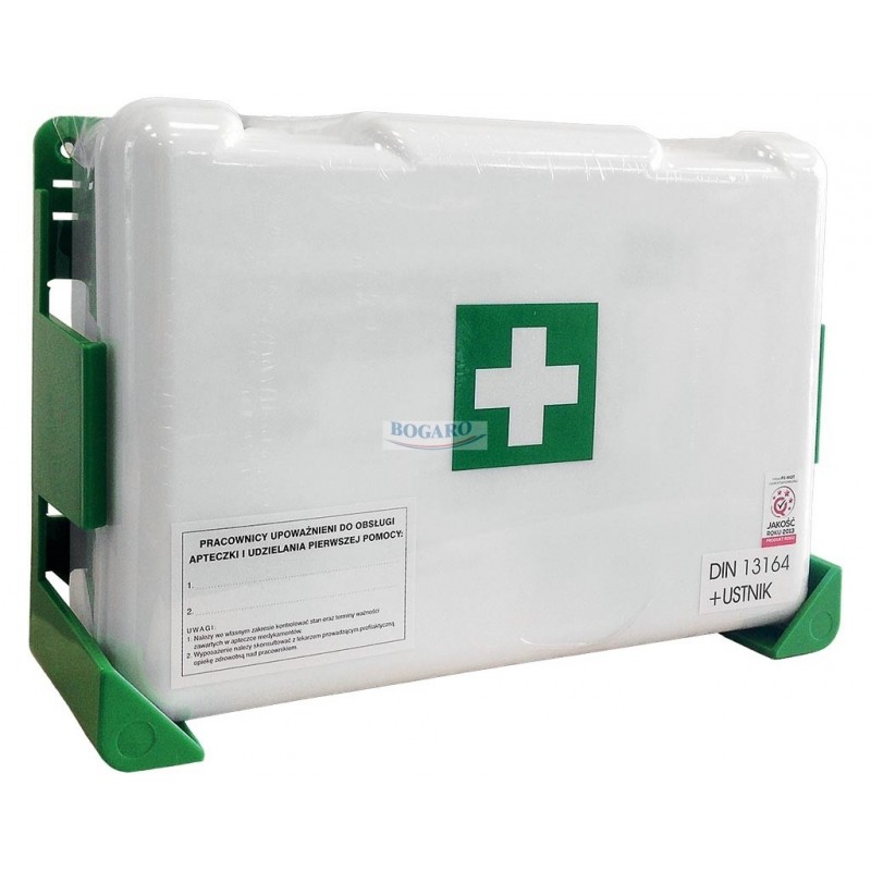Apteczka pierwszej pomocy, zakładowa. - wykonana z tworzywa sztucznego (polistyren) - wyposażenie zgodne z normą DIN 13164:1998 - plaster z opatrunkiem 6x10 cm (8 szt.) - plaster na szpulce 5 m x 2,5 cm (1 szt.) - bandaż elastyczny 4 m x 6 cm (2 szt.) - bandaż elastyczny 4 m x 8 cm (3 szt.) - rękawiczki winylowe (2 pary) - chusta opatrunkowa 60x80 cm (1 szt.) - chusta opatrunkowa 60x40 cm (2 szt.) - bandaż z kompresem (opatrunek indywidualny) 8x10 cm (3 szt.)