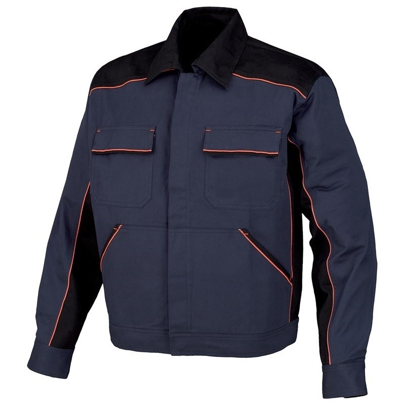 Zapięcie na zamek błyskawiczny zakryty listwą, cztery kieszenie, szerokość pasa regulowana za pomocą guzików. Chowana zawieszka na identyfikator.