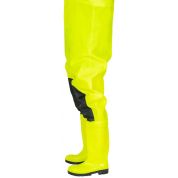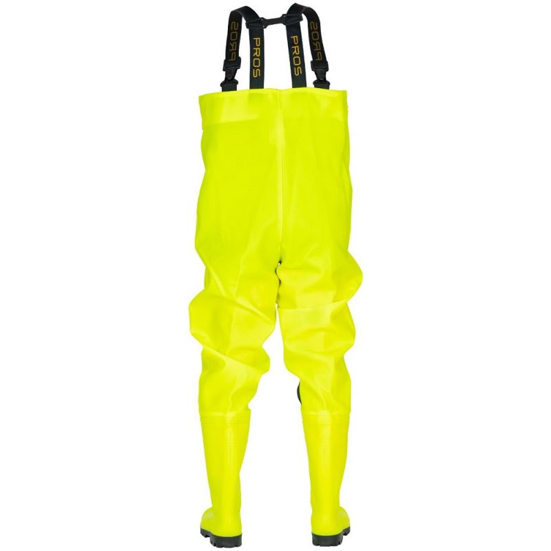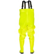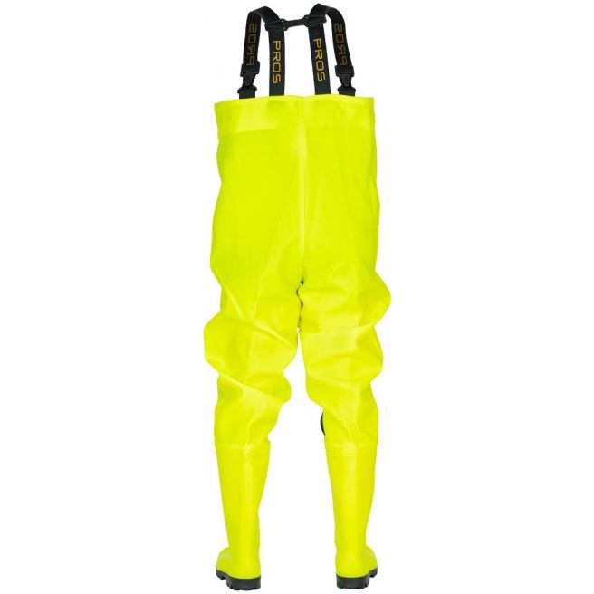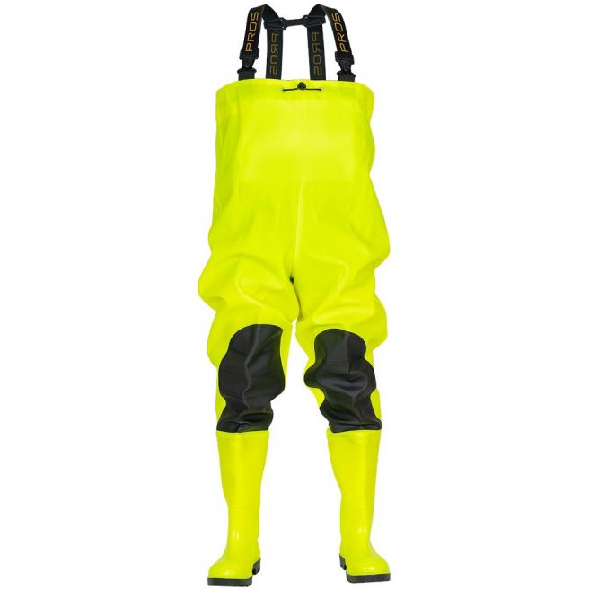 Spodniobuty wodochronne, z wgrzanymi na stałe, wysokiej jakości kaloszami. Podwyższona odporność na uszkodzenia mechaniczne poprzez dodatkowe wzmocnienia na kolanach. Technika obustronnego zgrzewania zwiększa wytrzymałość szwów. Specjalna wkładka chroni podeszwę przed przebiciem, a nosek zwiększa bezpieczeństwo palców stóp. Możliwość regulacji obwodu na wysokości klatki piersiowej. Kieszeń wewnętrzna ułatwia przechowywanie dokumentów. Kolor fluo zapewnia lepszą widoczność.