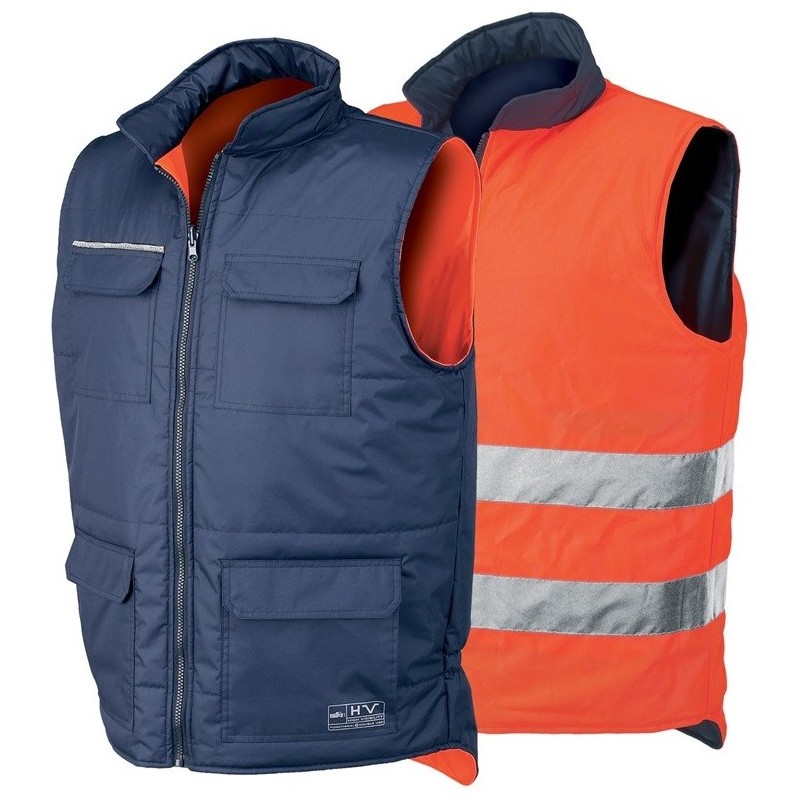 Praktyczna kamizelka dla wszystkich, którzy chodzą lub pracują na drogach: jedna strona zapewnia doskonałą widoczność, a druga modny sportowy wygląd. Cztery naszywane kieszenie po stronie granatowej i kieszeń na telefon po stronie odblaskowej.