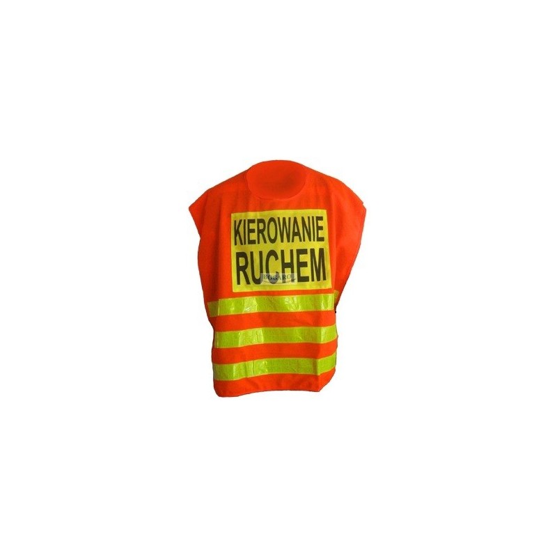 - napis "Kierowanie Ruchem" na żółtym fluorescencyjnym tle z przodu oraz z tyłu kamizelki;