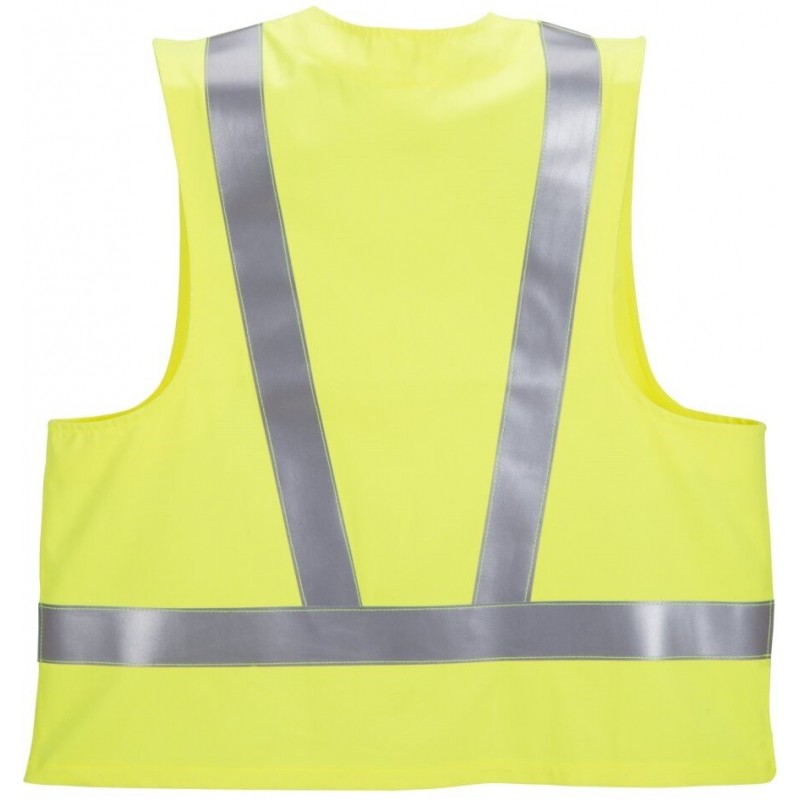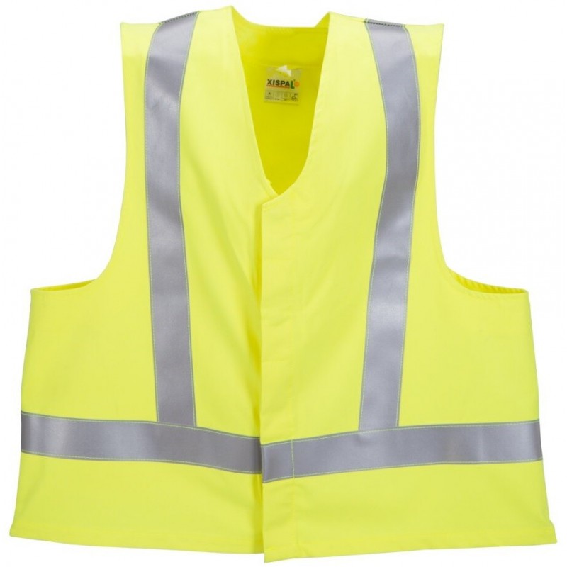 Kamizelka ostrzegawcza, trudnopalna, antyelektrostatyczna. Wykonana z tkaniny akrylowej art. XISPAL 827 RS HV ANTIESTATICO w kolorze jaskrawym żółto-zielonym. Odblaskowe, trudnopalne taśmy o szerokości 50 mm, art. RETROLUX FLR 600. Kamizelka zapinana z przodu na cztery napy przykryte plisą. Dół podwinięty i przestębnowany. Wokół całego obwodu kamizelki na wysokości pasa naszyty poziomo jeden pas odblaskowy, a z przodu, przez ramiona i z tyłu - dwa pasy ukośne.