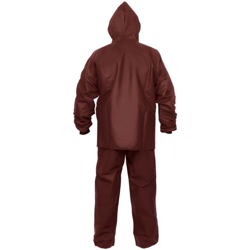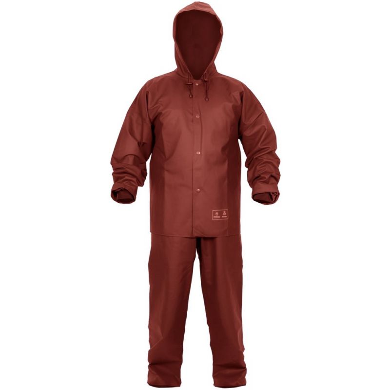 Ubranie przeciwdeszczowe składające się z kurtki o długości ¾ oraz wygodnych spodni ogrodniczek, niezastąpione w pracy w trudnych warunkach pogodowych. Kurtka zaopatrzona w funkcjonalny, regulowany kaptur. Wiatrołapy w rękawach zapobiegają dostawaniu się wody do wnętrza. Spodnie z regulowanymi szelkami z szeroką gumą z tyłu. Ubranie wykonane techniką obustronnego zgrzewania, co skutecznie zwiększa wytrzymałość szwów.