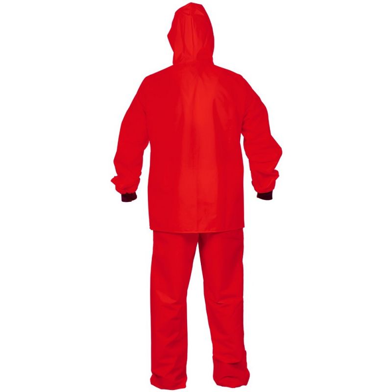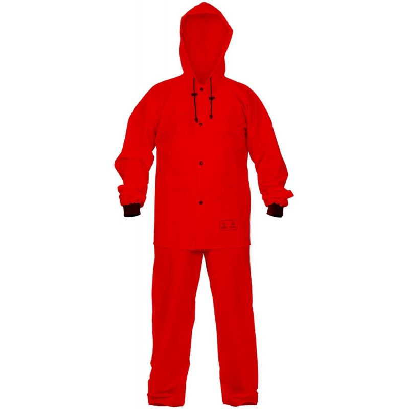 Ubranie przeciwdeszczowe składające się z kurtki o długości ¾ oraz wygodnych spodni ogrodniczek, niezastąpione w pracy w trudnych warunkach pogodowych. Kurtka zaopatrzona w funkcjonalny, regulowany kaptur. Wiatrołapy w rękawach zapobiegają dostawaniu się wody do wnętrza. Spodnie z regulowanymi szelkami z szeroką gumą z tyłu. Ubranie wykonane techniką obustronnego zgrzewania, co skutecznie zwiększa wytrzymałość szwów.