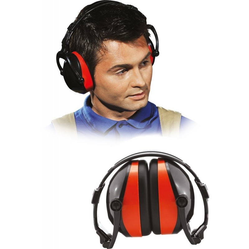 Ochronniki słuchu w czerwonym kolorze z czarnymi dodatkami.