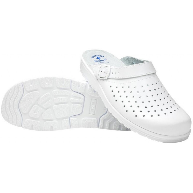 Obuwie ortopedyczne MEDIBUT 04AB w kolorze białym to buty wykonane według najnowocześniejszych technologii pozwalające uzyskać niezbędne bezpieczeństwo. Najwyższej jakości materiał z miękkiej skóry posiada perforowaną cholewkę z możliwością regulacji tęgości i podbicia przyszytą wraz z wyściółką do podeszwy na całym obwodzie. Podeszwa wykonana z poliuretanu wyposażona w bieżnik antypoślizgowy oraz pełny profil ortopedyczny, zapewniający solidną przyczepność na trudnych podłożach. Dodatkowo podeszwa absorbuje też niekorzystną energię w części piętowej. Dużą zaletą buta 04A od MEDIBUT jest też spora liczba otworów umożliwiających skuteczną filtrację powierza wewnątrz buta, co znacząco podnosi komfort jego użytkowania.