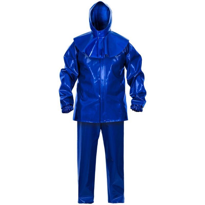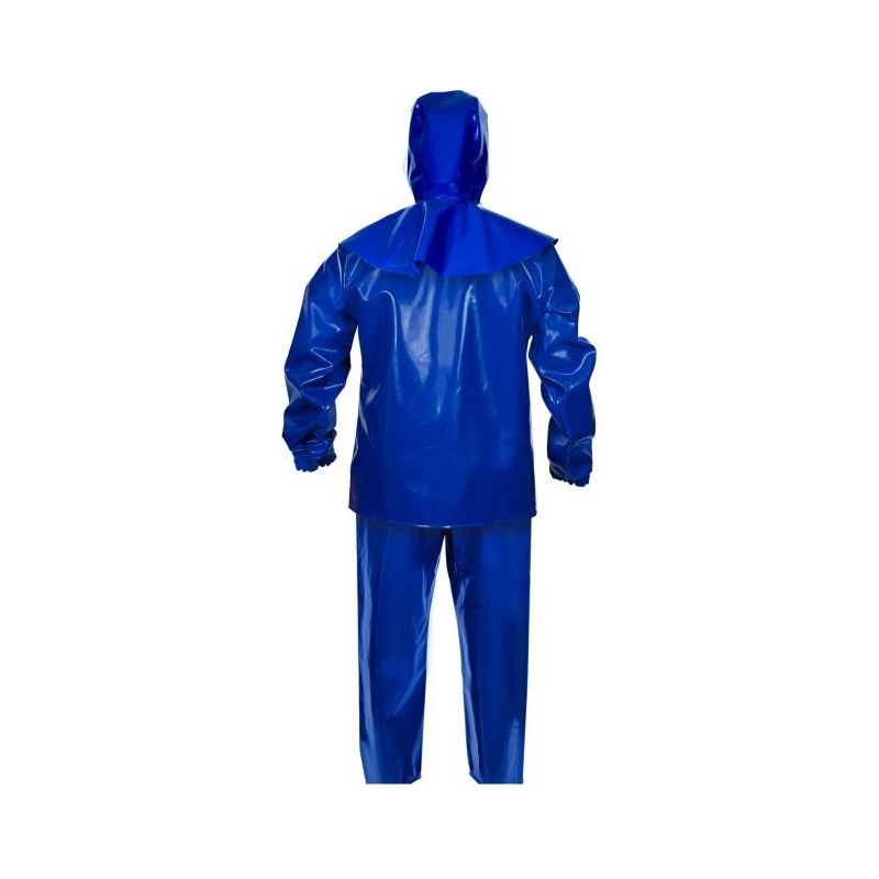 Kompletny zestaw ubrania wykonanego techniką obustronnego zgrzewania, co skutecznie zwiększa wytrzymałość szwów. Dedykowane dla przemysłu chemicznego, szczególnie do prac w kontakcie ze żrącymi substancjami. Złożone z kurtki zapinanej na napy przykryte plisą, spodni ogrodniczek i kapuzy z kapturem. Funkcjonalność produktu podnoszą między innymi wiatrołapy w rękawach, regulowane szelki oraz stójka w górnej części ubrania.