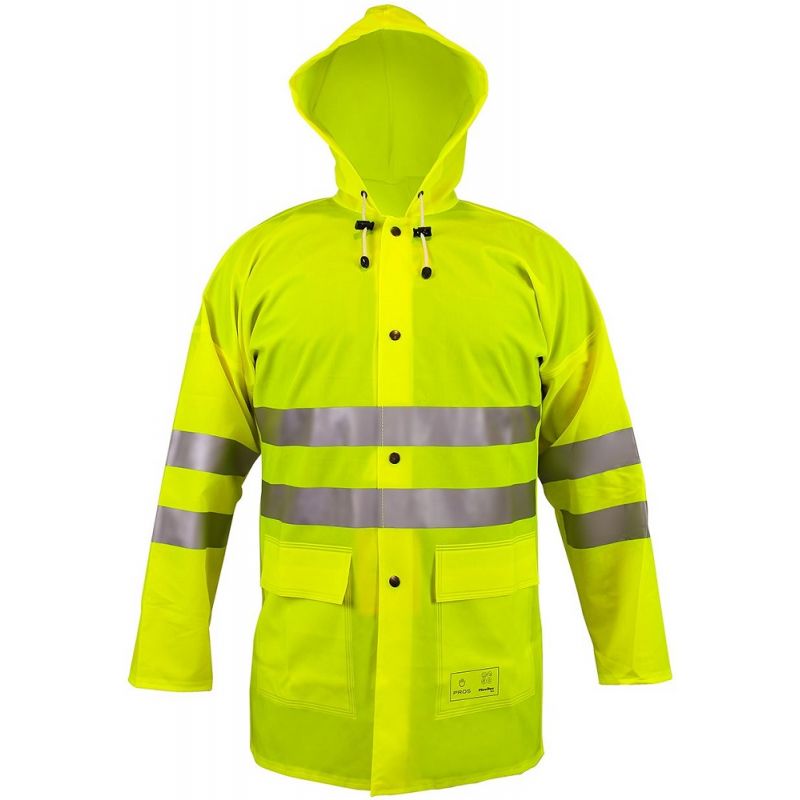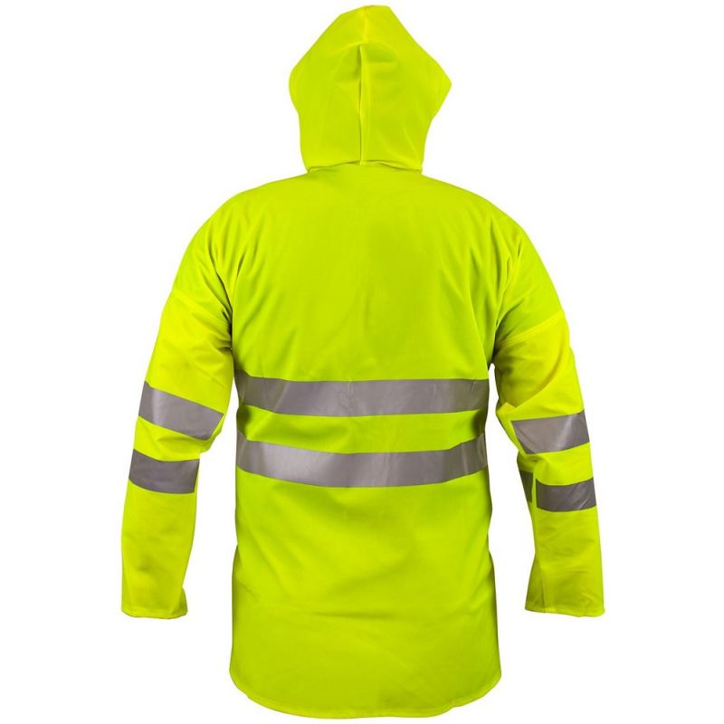 Kurtka zapewniająca ochronę przed deszczem i wiatrem, przeznaczona w szczególności do użytku w warunkach ograniczonej widzialności. Wykonana techniką obustronnego zgrzewania, co skutecznie zwiększa wytrzymałość szwów. Poziome pasy taśmy odblaskowej oraz tło w kolorze żółtym lub pomarańczowym zwiększają bezpieczeństwo użytkownika. Komfort podnosi dodatkowo regulowany kaptur, zapięcie na napy oraz dwie przednie kieszenie przykryte patkami.
