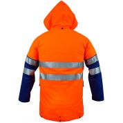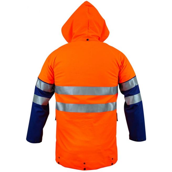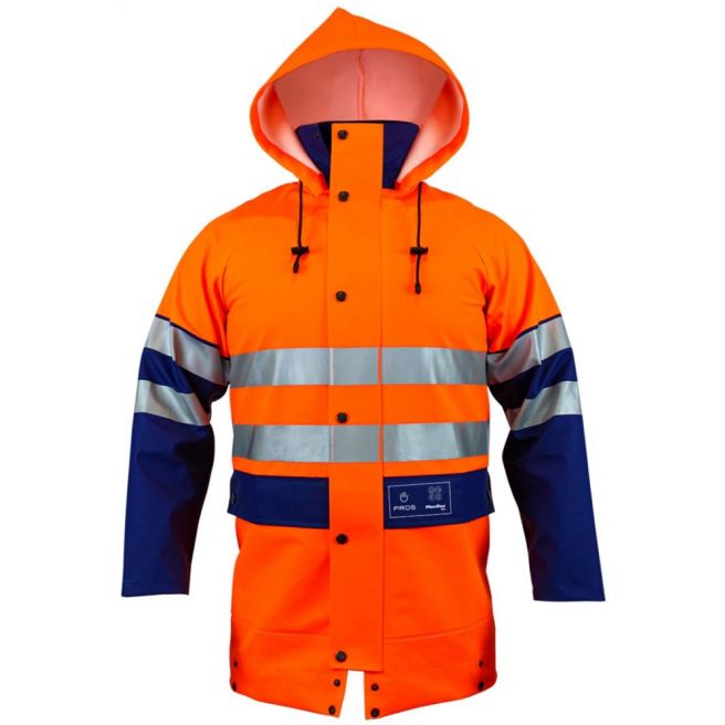 Dwukolorowa kurtka doskonale chroniąca przed deszczem, wiatrem i przy ograniczonej widzialności. Poziome dwa rzędy taśmy odblaskowe zwiększają bezpieczeństwo użytkownika. Na dole specjalna rynienka odprowadzająca wodę zabezpieczając przed zalaniem dolnej części odzieży. Funkcjonalne zapinanie na zamek kryty plisą oraz regulowany kaptur i kieszenie przednie przykryte patkami. Kurtka wykonana techniką obustronnego zgrzewania, co skutecznie zwiększa wytrzymałość szwów.