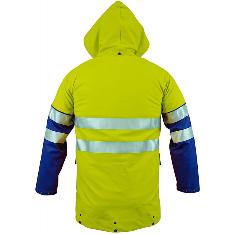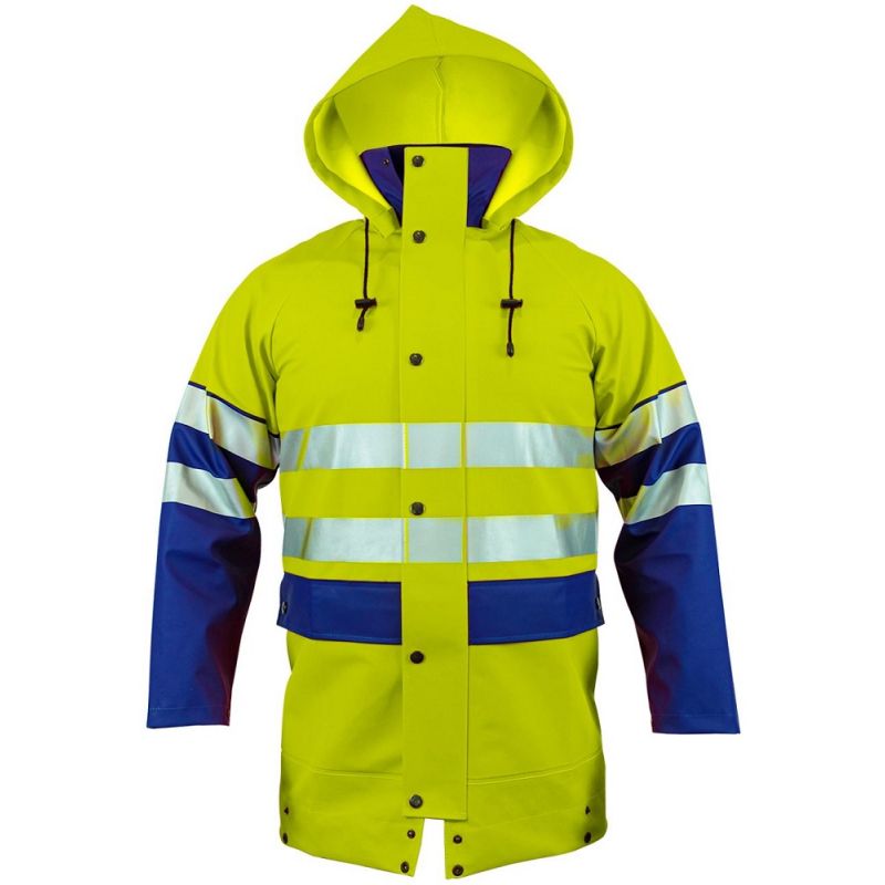 Dwukolorowa kurtka doskonale chroniąca przed deszczem, wiatrem i przy ograniczonej widzialności. Poziome dwa rzędy taśmy odblaskowe zwiększają bezpieczeństwo użytkownika. Na dole specjalna rynienka odprowadzająca wodę zabezpieczając przed zalaniem dolnej części odzieży. Funkcjonalne zapinanie na zamek kryty plisą oraz regulowany kaptur i kieszenie przednie przykryte patkami. Kurtka wykonana techniką obustronnego zgrzewania, co skutecznie zwiększa wytrzymałość szwów.