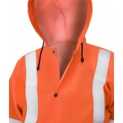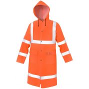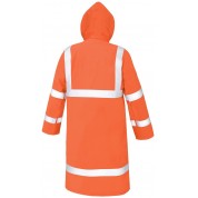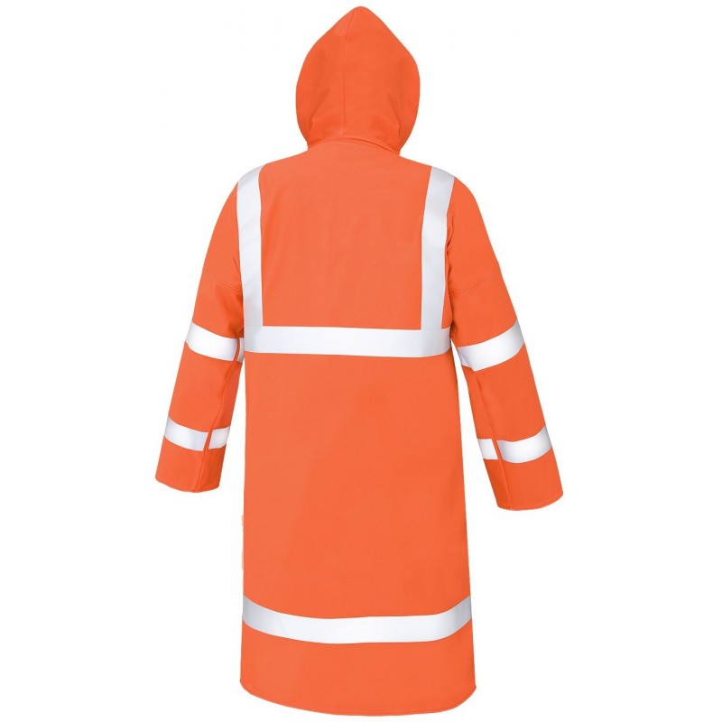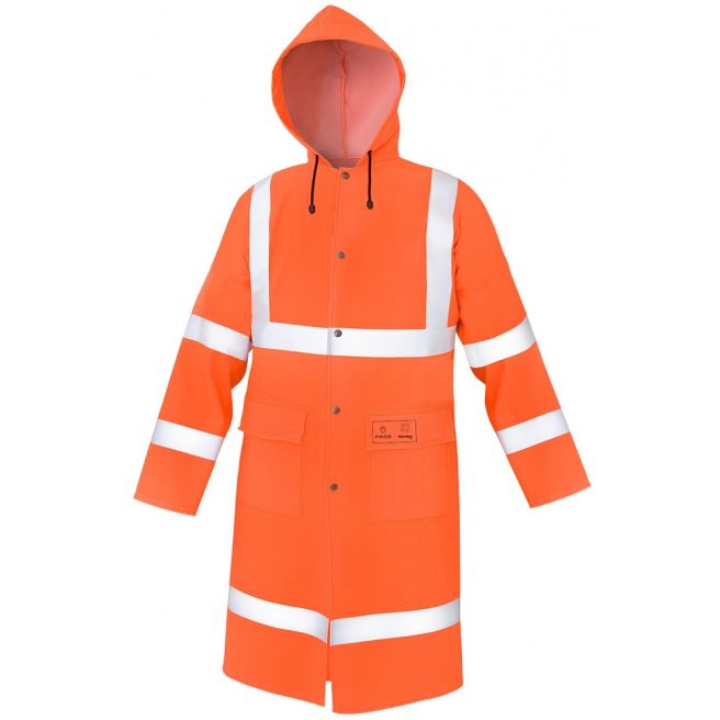 Płaszcz do użytku przy ograniczonej widzialności, chroniący przed wiatrem i deszczem. Wykonany techniką obustronnego zgrzewania, co skutecznie zwiększa wytrzymałość szwów. Dla lepszej widoczności, prócz materiału fluo, zastosowano taśmy odblaskowe w układzie poziomym i pionowym. Zapięcie na napy oraz regulowany kaptur, jak również patki nad kieszeniami przednimi, zwiększają komfort użytkowania.
