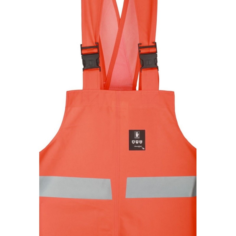 Spodnie idealne do pracy w trudnych warunkach pogodowych i ograniczonej widoczności, jako uzupełnienie kurtek PROS o podobnych parametrach. Wykonane techniką obustronnego zgrzewania, co skutecznie zwiększa wytrzymałość szwów. Specjalne poziome taśmy odblaskowe na nogawkach poprawiają bezpieczeństwo użytkownika. Funkcjonalność i komfort podnoszą regulowane szelki z szeroką gumą z tyłu.