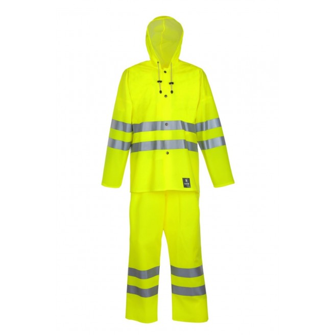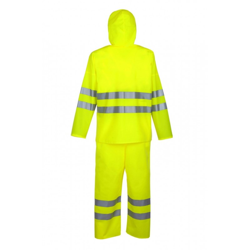 Ubranie składające się z kurtki ¾ oraz spodni ogrodniczek do pracy w złych warunkach atmosferycznych. Dla zwiększenia bezpieczeństwa użytkownika zastosowano taśmy odblaskowe na korpusie, rękawach i nogawkach. Wygodne zapinanie kurtki na napy. Spodnie z regulowanymi szelkami i z dodatkową, szeroką gumą na plecach. Ubranie wykonano techniką obustronnego zgrzewania znacząco zwiększającą wytrzymałość szwów.