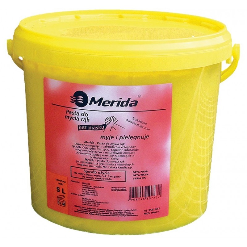 Pasta do mycia rąk MERIDA. - doskonale usuwa zabrudzenia chroniąc skórę rąk - zawiera składniki tworzące ochronną warstwę zapobiegającą podrażnieniom skóry - pasta nie zatyka kanalizacji - nie zawiera piasku, środkiem ściernym jest mączka drzewna - testowana dermatologicznie - nanosić na mokre ręce bezpośrednio z opakowania - opakowanie: wiadro 5 l