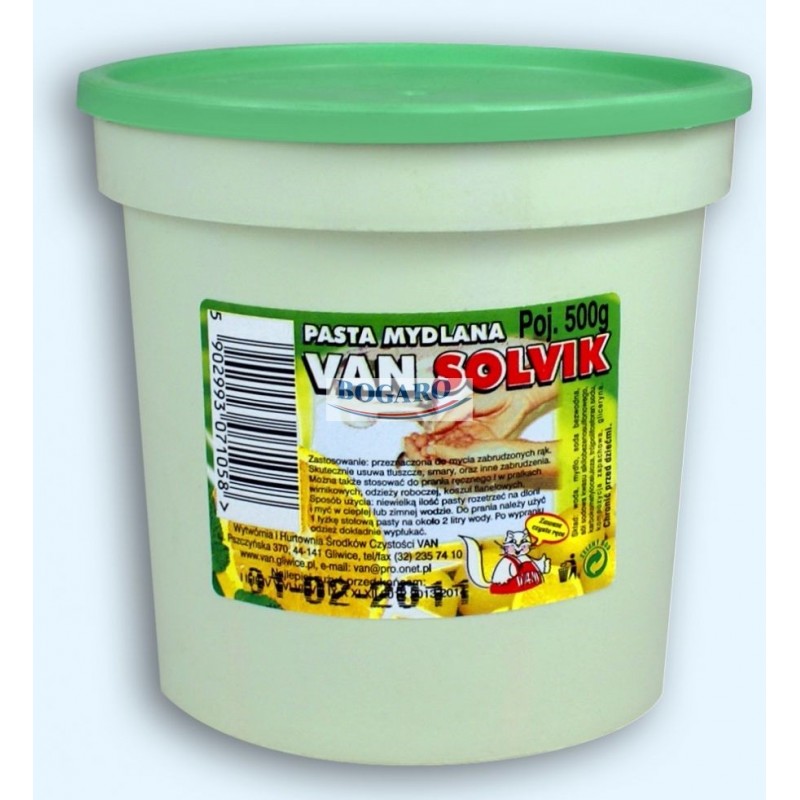 Pastę mydlaną VAN – SOLVIK stosuje się na wilgotne ręce, myjąc je do usunięcia zabrudzeń. Spłukać wodą. W razie konieczności mycie powtórzyć. Pastę mydlaną stosuje się do usuwania niedużych zabrudzeń takich jak oleje, tłuszcze itp. Szczególnie polecana w gospodarstwach domowych.