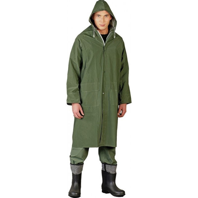 Płaszcz przeciwdeszczowy z kapturem PPD Z wykonany z połączenia gumy i poliestru. Model cechujący się dobrą wytrzymałością zapewniający niezbędną ochronę przed deszczem, wiatrem i innymi niekorzystnymi warunkami atmosferycznymi. Płaszcz nieprzemakalny ochroni również przed niegroźnymi cieczami