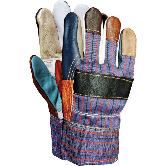 Rękawice ochronne ocieplane wzmacniane różnokolorową skórą bydlęcą.