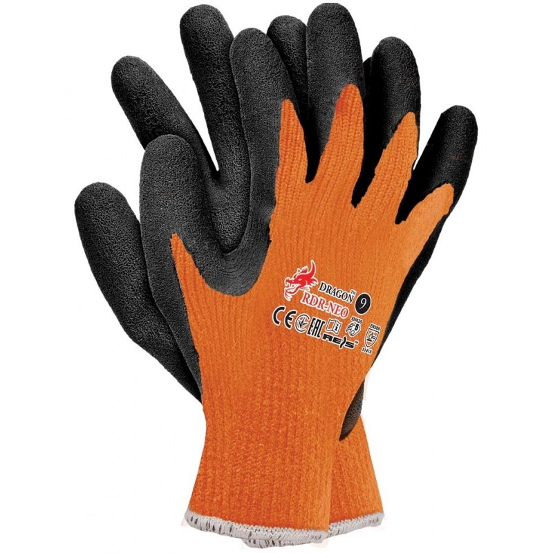 Rękawice ochronne wykonane z fluorescencyjnej dzianiny, powlekane.