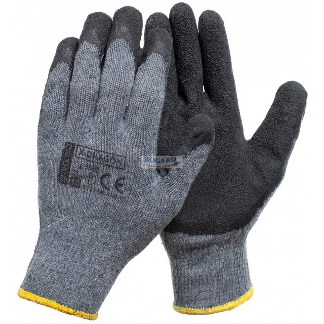 Rękawice X-DRAGON wykonane z dziany poliestrowo bawełnianej w kolorze szarym, powlekanej w części chwytnej lateksem o szorstkowanej strukturze. Bardzo dobra przyczepność. Zakończone ściągaczem. CE EN 388.