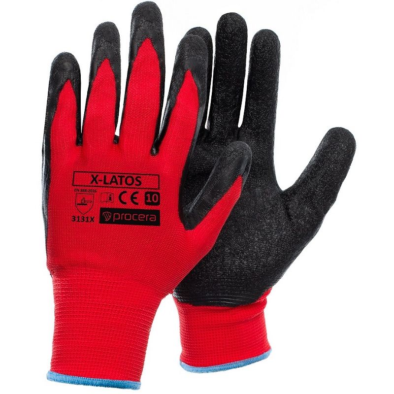 Rękawice X-LATOS wykonane z czerwonego poliestru, powlekane w części chwytnej lateksem o szorstkowanej strukturze. Idealne do prac manualnych. Bardzo dobra chwytność. Dobrze dopasowują się do kształtu dłoni. Rozciągliwe i elastyczne. Zakończone ściągaczem. CE EN 388.