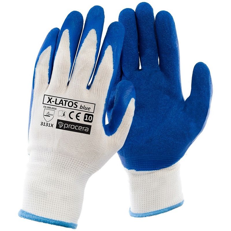 Rękawice X-LATOS BLUE wykonane z poliestru, powlekane w części chwytnej lateksem o szorstkowanej strukturze. Idealne do prac manualnych. Bardzo dobra chwytność. Duża wytrzymałość na ścieranie. Dobrze dopasowują się do kształtu dłoni. Rozciągliwe i elastyczne. Zakończone ściągaczem. CE EN 388.
