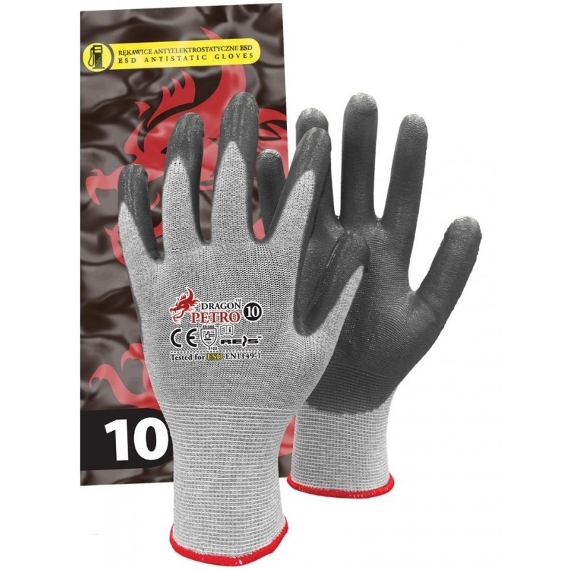 PETRO marki Dragon to solidne rękawice antyelektrostatyczne ESD wykonane z przędzy nylonowo-karbonowej dobrze przylegające do dłoni. W części chwytnej powlekane nitrylem. Rękawice zgodne z normami EN388 (poziomy odporności: 4 1 2 2 X), EN420 oraz EN16350