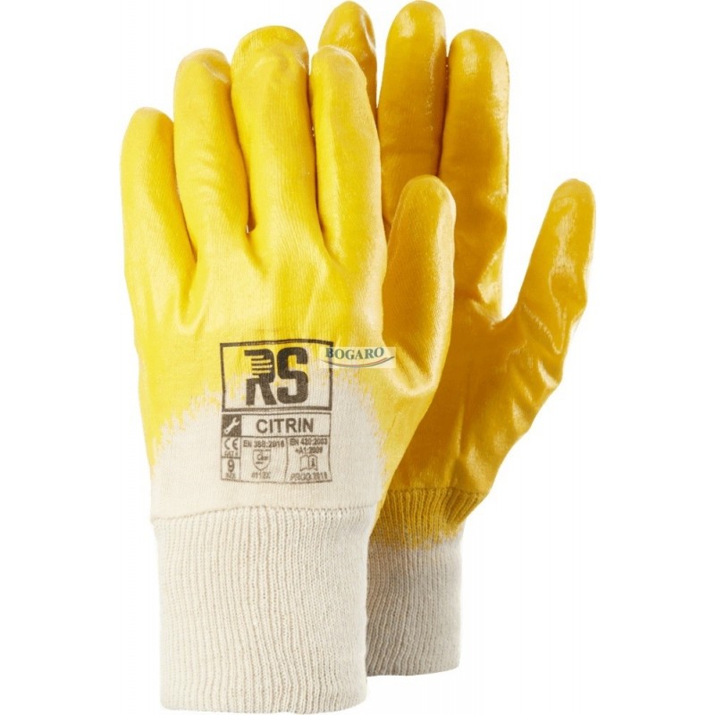 CITRIN jest powleczony do wysokości połowy dłoni żółtym nitrylem, wykonana jest na wkładce bawełnianej. Mieszanka nitrylowa zastosowana w tej rękawicy ma optymalne stężenie, a utwardzacze są dobrane tak by zwiększały wytrzymałość powłoki nitrylowej przy zachowaniu optymalnej ceny. Tkanina bawełniana wykonana jest w technologii Interlock®, co gwarantuje chłonność potu i zwartość ściegu. Takie rozwiązanie technologiczne zwiększa trwałość rękawicy i zapobiega to powstawaniu otarć naskórka. Pokrycie nitrylem zapewnia olejoodporność i wodoodporność. Rozmiarowanie rękawicy pozwala na dobranie idealnego rozmiaru pasującego do dłoni tak, aby umożliwić wygodną pracę zarówno tę o charakterze ogólnym i monterskim, jak również taką która wymaga bardzo dużej precyzji. Zakończenie miękkim ściągaczem utrzymuje rękawicę we właściwym położeniu na nadgarstku nie uciskając go.