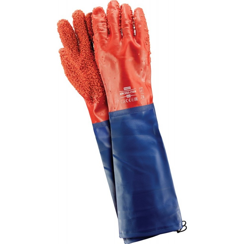 Rękawice ochronne wykonane z PCV, zakończone rękawem.