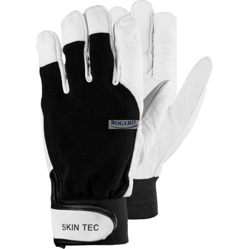 RS SKIN TEC jest rękawicą monterską wzmacnianą selekcjonowaną skórą licową kozią. Skóra wyprawiana tak by wewnątrz była przyjemna i miękka – aksamitna, zaś na zewnątrz gładka. Takie wyprawienie pozwala połączyć ergonomię pracy i ochronę dłoni również w wymagających warunkach. Rozmiarowanie rękawicy pozwala na dobranie idealnego rozmiaru pasującego do dłoni tak, aby umożliwić wygodną pracę zarówno tę o charakterze ogólnym i monterskim, jak również taką która wymaga bardzo dużej precyzji. Wykonanie z selekcjonowanej naturalnej skóry koziej i wysokiej jakości bawełny umożliwia swobodne oddychanie dłoni, co znacząc poprawia ergonomię pracy. Żaden z elementów w części dłonicowej nie jest szyty, całość wykonana jest z jednego płata skóry. Kciuk obszyty skórą zapewnia pełną ochronę dłoni i wydłuża żywotność rękawicy, dzięki ochronie najbardziej obciążonych w trakcie pracy miejsc na rękawicy. Zapięcie na rzep uniemożliwia zsunięcie się rękawicy z dłoni.