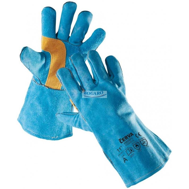 Rękawice całoskórzane z dwoiny wołowej, o długości 35 cm, z bawełnianą podszewką, wzmocnieniem w części wewnętrznej dłoni i krytymi szwami.
