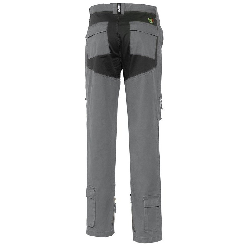 Spodnie z wieloma kieszeniami w 100% z płótna bawełnianego, w miejscach najbardziej narażonych na rozciąganie wstawki z elastycznej tkaniny, zapewniające komfort użytkowania, pas regulowany za pomocą praktycznego systemu guzików.