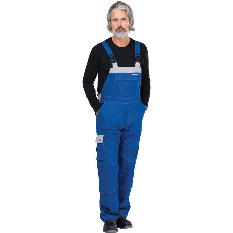 Spodnie ochronne ogrodniczki. - 100% bawełna - gramatura 300 g/m2 - cztery kieszenie: dwie boczne i dwie tylne na rzep - duża kieszeń na rzep w górnej partii ogrodniczek - dodatkowe kieszenie na nogawkach, w tym na telefon komórkowy - w tylnej części ściągacz w pasie, dzięki czemu spodnie dopasowują się do sylwetki - gumki w szelkach, ułatwiające swobodne poruszanie się - końcówka do przypięcia kluczy - na kolanach dodatkowe kieszenie na wkładki nakolannikowe KING BEE - charakteryzuje się zwiększoną wytrzymałością