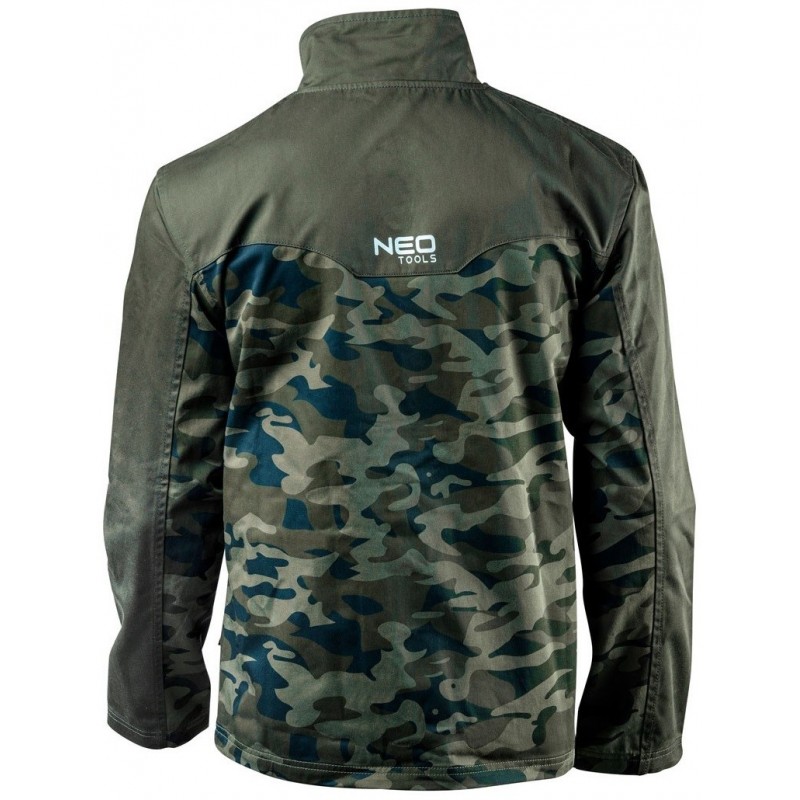 Bluza robocza NEO z serii CAMO wykonana z wysokiej jakości bawełniano-poliestrowej tkaniny. Bluza zapewnia komfort użytkowania dzięki specjalnej konstrukcji rękawa, regulacji obwodu mankietu oraz wysokiej stójce. Produkt posiada kombinację wielofunkcyjnych kieszeni zapinanych na suwak, rzepy oraz zatrzaski. Podwojny materiał na barkach zapewnia wyższą odporność na uszkodzenia mechaniczne. Bluzę wyróżnia unikalny wzór moro, a nowoczesny krój pozwala na użytkowanie produktu również poza pracą. Gwarantem jakości jest certyfikat europejski oraz wykonanie zgodne z normą EN ISO 13688:2013. Marka NEO spełnia oczekiwania profesjonalistów.