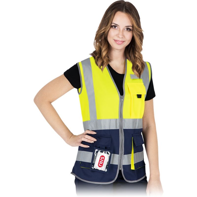 Damska kamizelka ostrzegawcza z pasami odblaskowymi KOS-LADY YG zwiększająca widoczność i bezpieczeństwo użytkownika nawet podczas trudnych warunków oświetleniowych