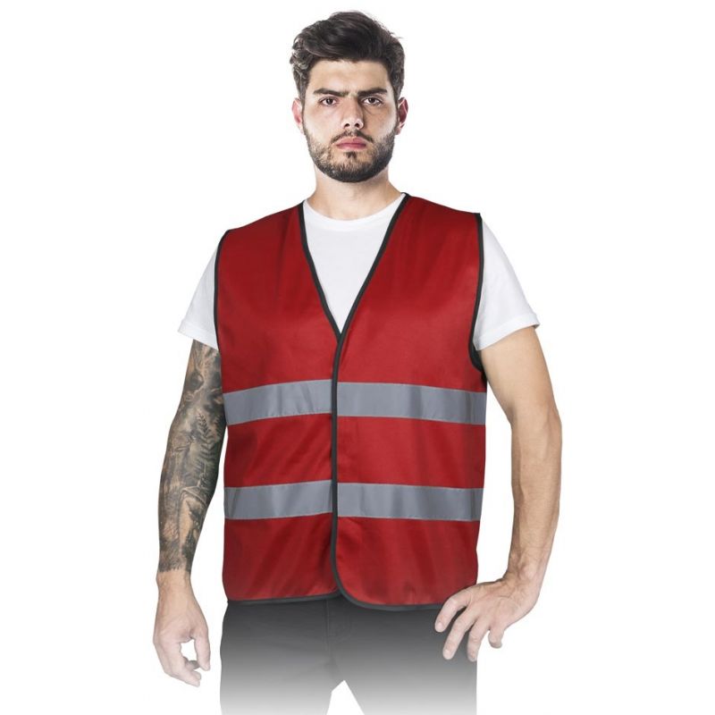 Kamizelka ostrzegawcza z dwoma poziomymi pasami odblaskowymi.