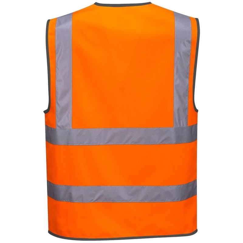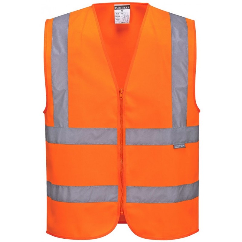 Kamizelka z pasami ostrzegawczymi zapinana na zamek błyskawiczny. Maksymalna widoczność w warunkach słabego światła.
