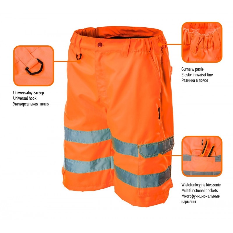 Krótkie spodenki robocze NEO (81-781-L) o intensywnej widzialności, to praktyczne rozwiązanie zwiększające bezpieczeństwo użytkownika, polegające na sygnalizowaniu jego obecności w każdych warunkach oświetlenia dziennego jak i w ciemności w sztucznym oświetleniu np. światłami pojazdów. Wykonane z wytrzymałego poliestrowo- bawełnianego materiału o wysokiej jakości, idealnie spełniają swoją funkcję podczas pracy w upalne dni. Gwarantem jakości jest certyfikat europejski oraz wykonanie zgodne z normą EN ISO 13688:2013. Zgodność z europejskimi standardami bezpieczeństwa zapewnia certyfikat CE. Marka NEO spełnia oczekiwania profesjonalistów.
