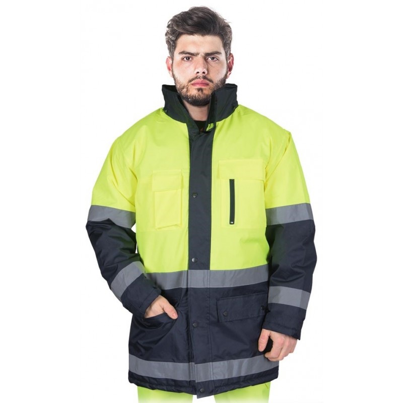 Kurtka zimowa z pasami odblaskowymi.