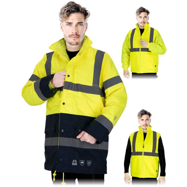 - tkanina we fluorescencyjnym kolorze i pasy odblaskowe zwiększające widoczność