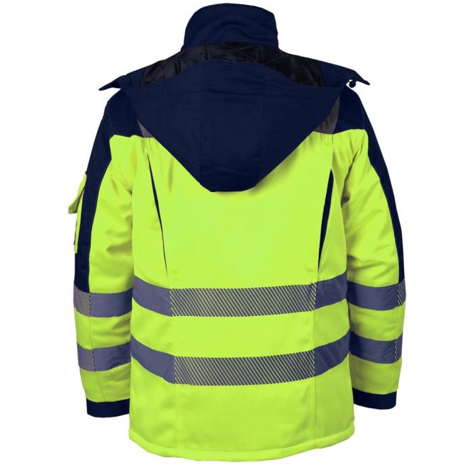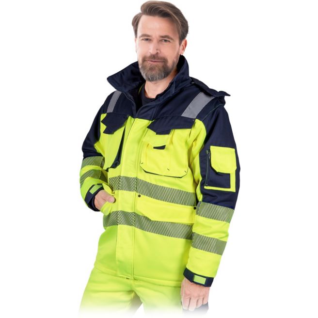 Ocieplana kurtka zimowa LH-JACWINTER wykonana z fluorescencyjnej tkaniny w kolorze żółto-granatowym. Konstrukcja z połączenia poliestru i bawełny zapewnia optymalną wytrzymałość i komfort użytkowania.