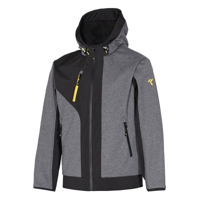Softshell z czterema wodoodpornymi zamkami, odpinany kaptur, trzy kieszenie zewnętrzne i dwie duże kieszenie wewnętrzne.