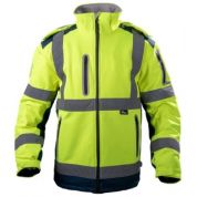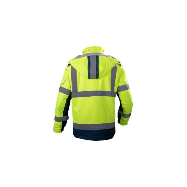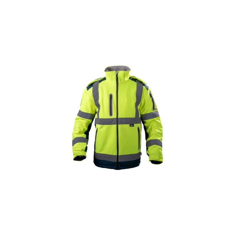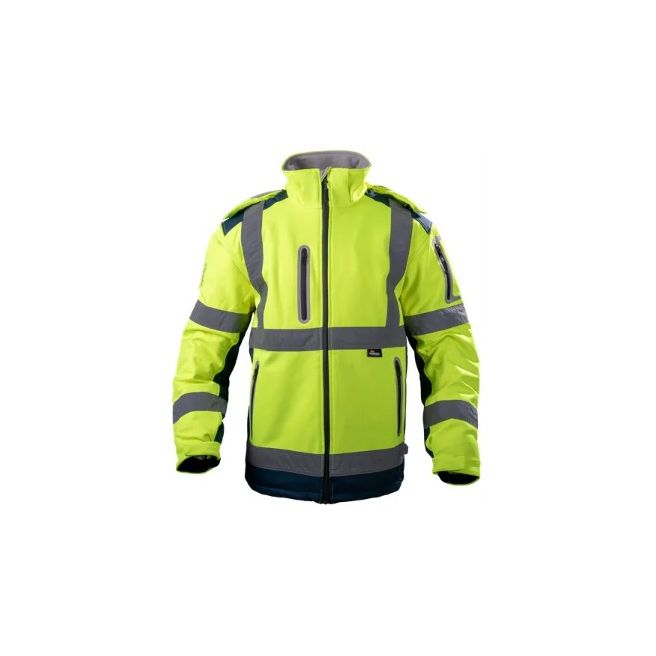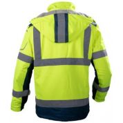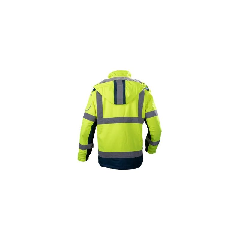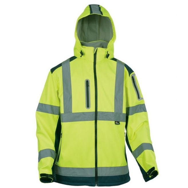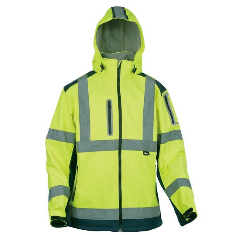 Kurtka Softshell z odpinanym i regulowanym kapturem, ostrzegawcza o intensywnej widzialności, w kontrastowych kolorach