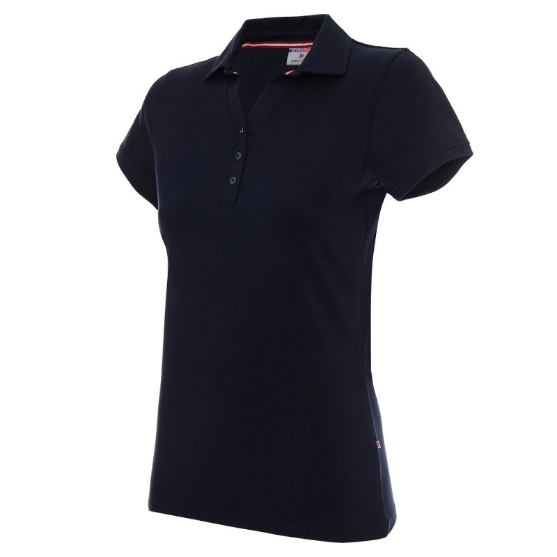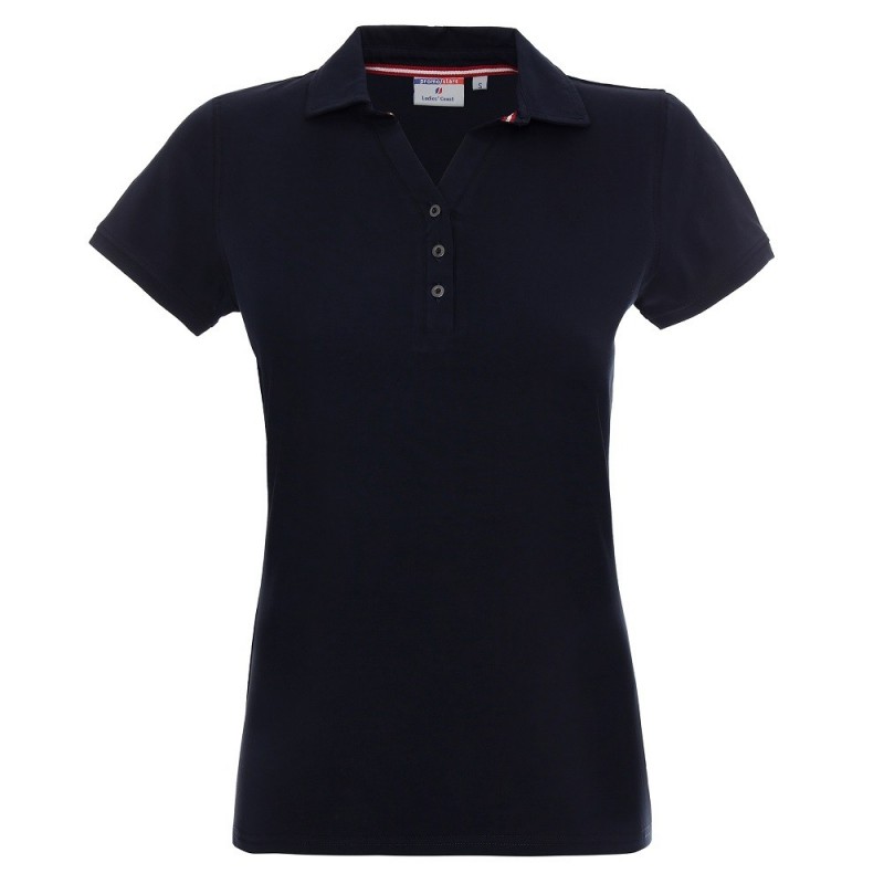 Damska koszulka polo Promostars Ladies Coast 42274 w granatowym kolorze wykonana z wytrzymałej dzianiny single jersey. Model o dopasowanym kroju, dzięki czemu dobrze dostosowuje się do sylwetki użytkownika. Specjalna taśma wzmacniająca i stabilizująca dodatkowo zwiększająca trwałość szwów. Silikonowe wykończenie sprawia, że materiał jest gładszy i milszy w dotyku