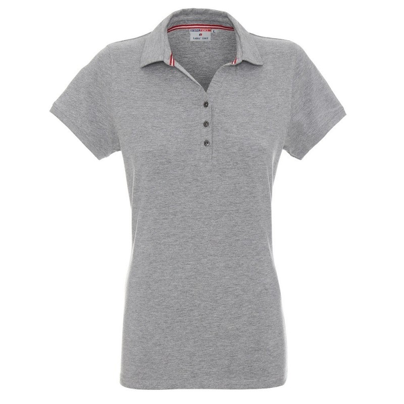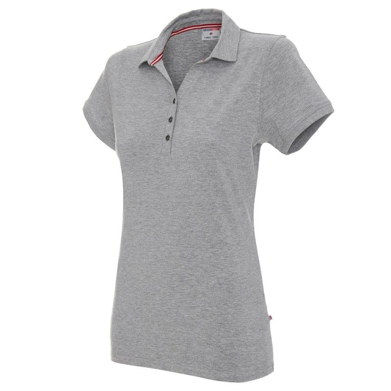 Damska koszulka polo Promostars Ladies Coast 42274 w szarym kolorze wykonana z wytrzymałej dzianiny single jersey. Model o dopasowanym kroju, dzięki czemu dobrze dostosowuje się do sylwetki użytkownika. Specjalna taśma wzmacniająca i stabilizująca dodatkowo zwiększająca trwałość szwów. Silikonowe wykończenie sprawia, że materiał jest gładszy i milszy w dotyku