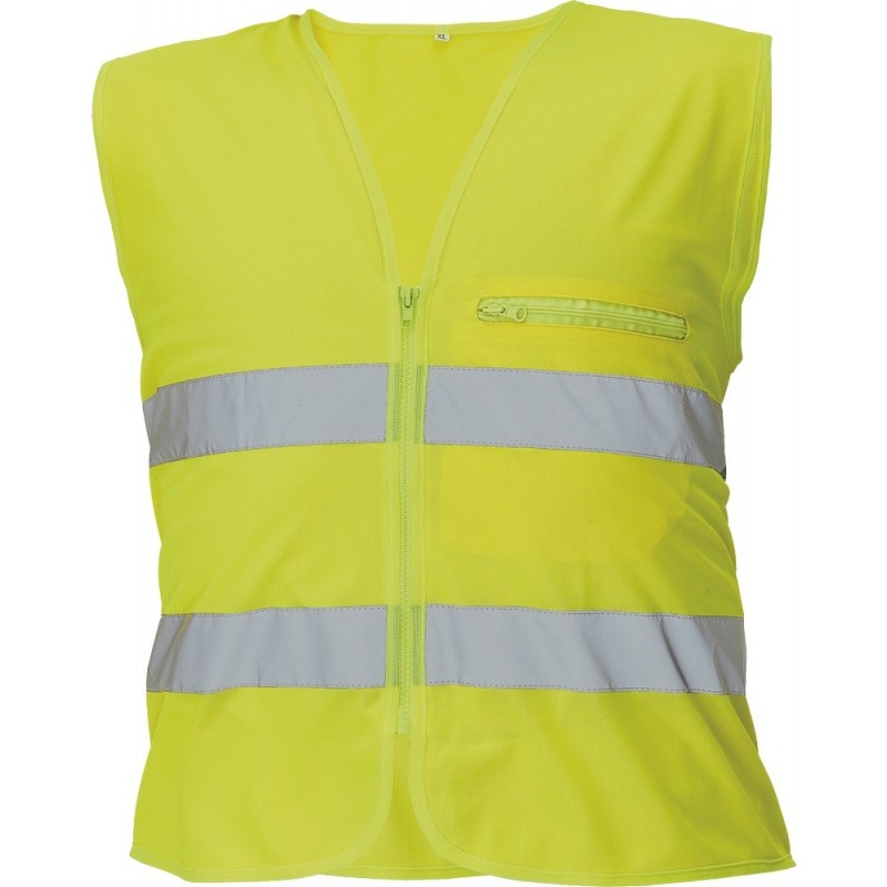 uniwersalna, odblaskowa kamizelka, którą łatwo złożyć i schować wewnątrz napiersiowej kieszonki.