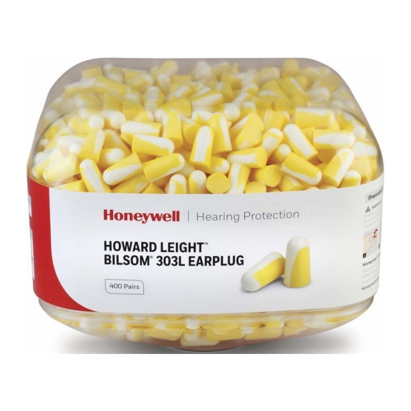 Pojemnik z zatyczkami BILSOM 303L do HL 400/ HONEYWELL spełnia normy EN 352-2 (Ochronniki słuchu-Wymagania ogólne- Część 2: Wkładki przeciwhałasowe). Ubytek słuchu spowodowany hałasem postępuje stopniowo dlatego ważne jest zapewnienie sobie i pracownikom odpowiedniej ochrony w trakcie narażenia na hałas. Formuła LIGHT STRIPE TM to połączenie żółtej i białej pianki poliuretanowej, dające odczucie miękkości zarówno w dłoni, jak i w uchu. Prawidłowe włożenie zatyczek polega na sięgnięciu nad głową wolną ręką, podciągnięciu ucha do góry i włożeniu zatyczki głęboko do kanału słuchowego. Przytrzymaniu jej przez 30 – 40 sekund, aż zatyczka całkowicie rozpręży się w kanaliku ucha. Po prawidłowym założeniu końce zatyczek nie powinny być widoczne dla osoby patrzącej od przodu na użytkownika zatyczek. Zatyczki BILNSOM są odporne na wypadanie z kanału słuchowego, mniejsze ciśnienie rozprężania zapewnia komfort długotrwałego noszenia. Gładka oporna na zabrudzenia powłoka zapobiega osadzaniu brudu na wkładce. Każda osoba ma inny kanał słuchowy dlatego bardzo ważne jest odpowiednie dopasowanie rozmiaru zatyczki, źle dobrany rozmiar spowoduje dyskomfort podczas noszenia i nie pełnowartościową ochronę słuchu.