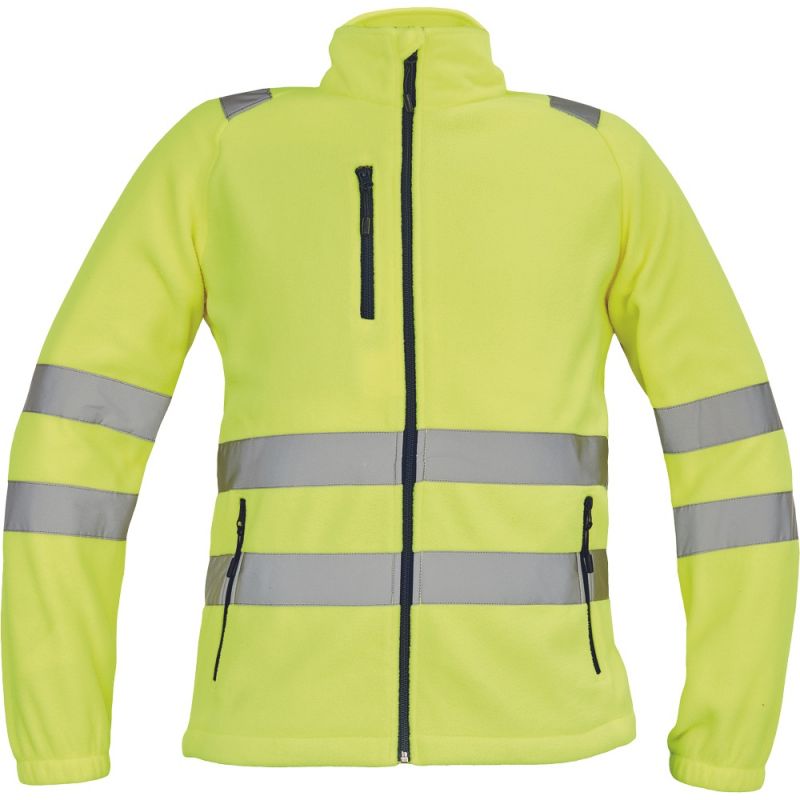 • ostrzegawcza męska bluza polarowa z odblaskowymi taśmami o szerokości 5 cm na ramionach, rękawach i tułowiu, zapinana na suwak • 1 kieszeń na piersi i 2 boczne kieszenie zapinane na zamek • elastyczne zakończenie rękawa • na dole bluzy sznurek do ściągania