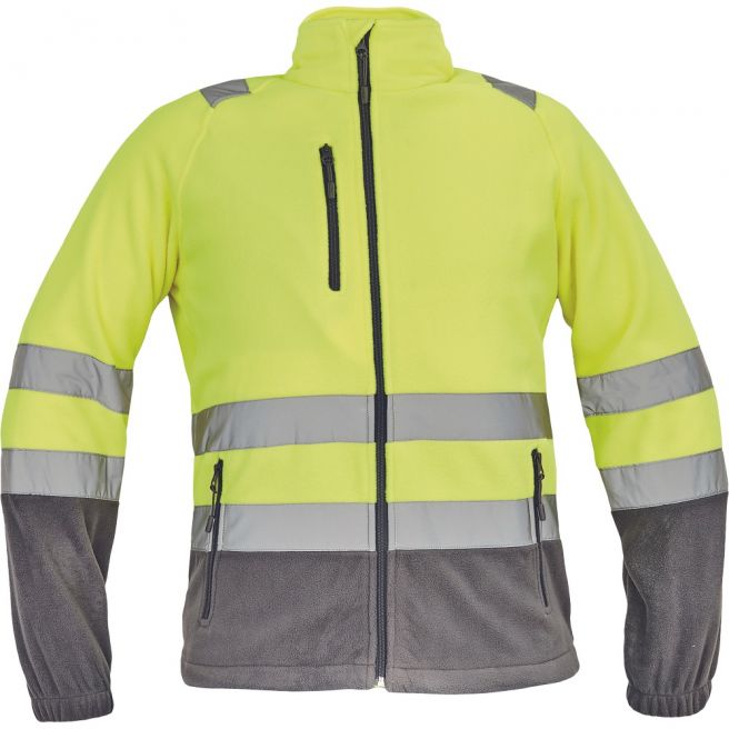 • ostrzegawcza męska bluza z odblaskowymi taśmami o szerokości 5 cm na ramionach, rękawach i tułowiu • zapięcie na suwak • 1 kieszeń na piersi i 2 boczne kieszenie zapinane na zamek • elastyczne zakończenie rękawa • na dole bluzy sznurek do ściągania