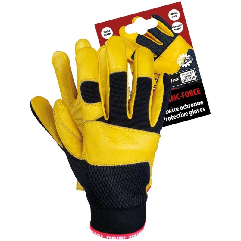 Rękawice ochronne wykonane z wysokiej jakości skóry koziej połączonej z tkaniną.