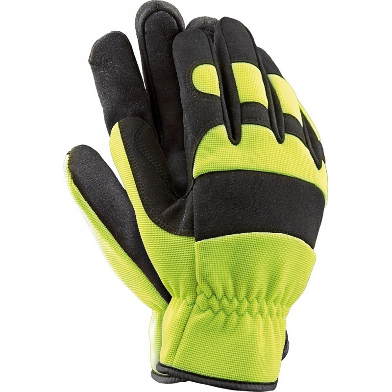 Rękawice ochronne wykonane z wysokiej jakości skóry syntetycznej połączonej z oddychającym materiałem spandex.